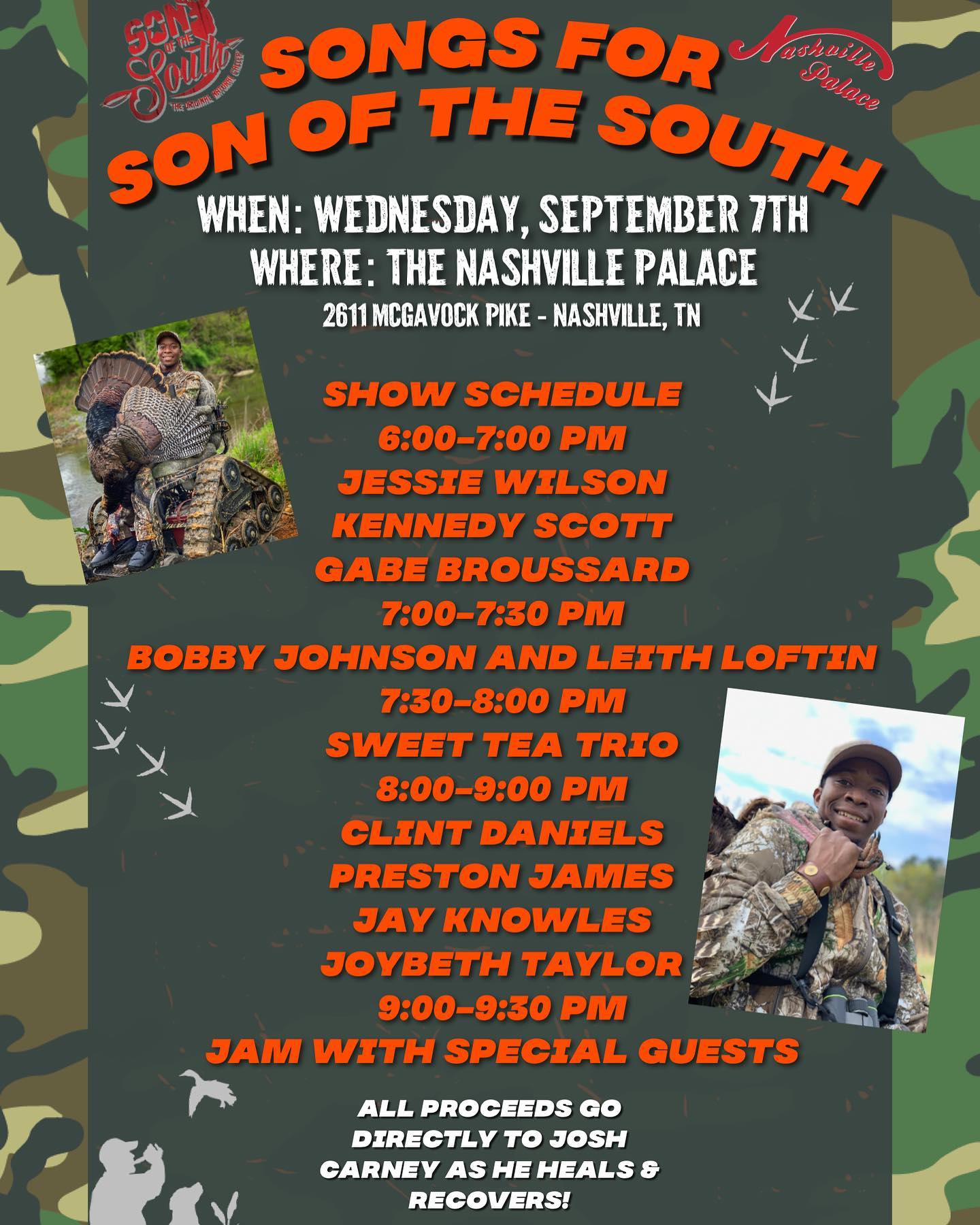 The latter was the case with an all-star concert at the legendary Nashville Palace when the ultra-talented friends of Josh Carney (known in the hunting community as “Son of the South”) came together to raise funds to aid him with his continued healing & recovery after having major surgery that resulted in 36 staples in his back.