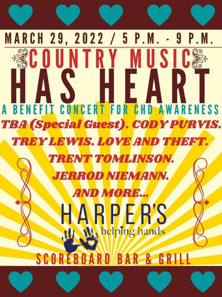 The gathering of amazing artists that contributed to one heck of a lineup included Trent Tomlinson, Jerrod Niemann, Love and Theft, Cody Purvis, Trey Lewis, Marty Raybon and more, but this night – sub-titled as “Country Music Has Heart” – was about such an important cause that the artists were simply the bonus attraction while the spotlight shined brightly on raising awareness for Congenital Heart Defects (CHD), and specifically, an adorable little girl named Harper.